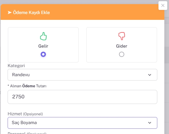 Bir randevu tamamlandığında ödeme alındığında kasa hareketi otomatik oluşur.